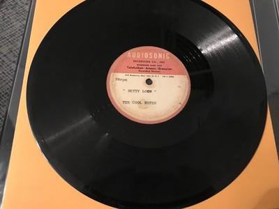 Woah! 10" 78rpm disc containing an unreleased version of "Betty Lou" and the otherwise unissued "Torpedo." The Cool Notes released one 45 on the Drum label out of Connecticut featuring Paul Kepler and Peter Concilio. This is a totally different recording of "Betty Lou" than appears on the record. The disc plays at 78rpm and my turntable is not equipped to play that speed, so I recorded it at 45rpm and adjusted the speed to 78 using Audacity software. Audiosonic labels with the band name and song titles typed in. I believe these are the same takes as the other copy I am offering; just no date written on these labels. Acetate has scuffs, marks, and spots of discoloration — this one has more scuffs and marks than the other copy.