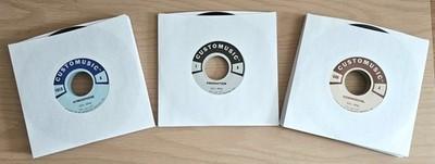 These records were played in small manufacturing shops, factories, retail stores and restaurants throughout Michigan. The owner of the company would drive to each of approximately 80 different customers to supply the latest records available. Each record has 3 songs on each side. The records were used from approximately 1958 to 1965 when Customusic changed their format and started using large 4 track tapes and special machines to play them. These are very rare as they were usually returned to the Canteen company & then destroyed."