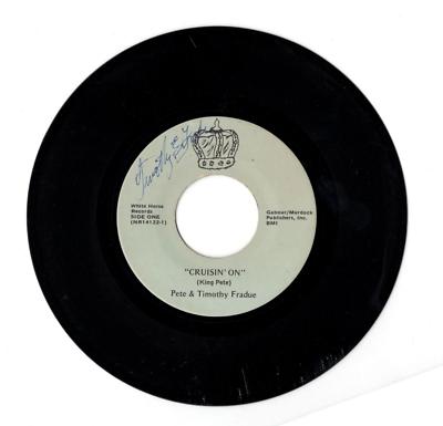 this is a rare obscure vintage soul 45 rpm record on Whitehorse label by Pete and timothy fradue...it is signed by timothy fradue.on side one ..the songs are side one: cruisin on and side two: confusion ..side two is excellent condition ...side one has scratch marks as seen in the photo.above It plays but has moderate noise at the beginning of the record where the scratches are ..you are still able to enjoy the music but it is noticeable...the autograph is in blue ink..ive seen only one of these and it has only petes signature not timothy's..whoever has that one might want the matching signature record.