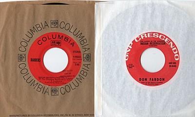 Back in 1968 I stashed some copies of records we were playing on the radio station, including the John D. Loudermilk song Indian Reservation by Don Fardon. It was a big hit, went to #20 in the U.S., #3 in UK. Then in 1971, the Raiders decided to record it. It was an even bigger hit, going to #1 on Billboard. I took a copy of that one home too. Never played them--they are virgin vinyl. I thought it would be fun to make them both available in such good condition for collectors. So here you go! The two hit version of The Lament of the Cherokee Indian Reservation, by Don Fardon and The Raiders! You'll have both to compare.